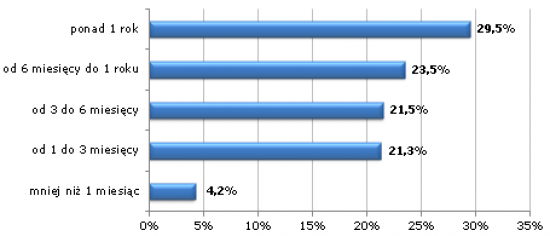 Ponad 23% ankietowanych zadeklarowało, iż poszukiwanie pracy zajmuje obecnie od 6 miesięcy do 1 roku. Pracodawcy ze względu na kryzys ekonomiczny i niestabilną sytuację zawieszają poszukiwania. Często starają się także minimalizować koszty i dokonując zmian wewnątrz firmy szukać oszczędności. Absolwenci dłużej muszą poszukiwać pracy. Brak doświadczenia zmniejsza ich szanse na szybkie znalezienie zatrudnienia. Chwilowym rozwiązaniem jest poszukiwanie stażu, który z czasem może zaowocować umową o pracę.