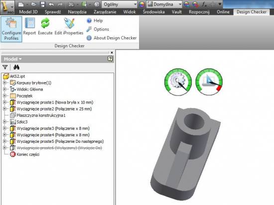 Checker Design for Inventor ® jest to bezpłatna aplikacja umożliwiająca definicję norm i standardów projektowych w procesie modelowania części. Użytkownik ma możliwość w czasie rzeczywistym sprawdzenie czy stosowane metody projektowania są zgodne ze standardami firmy i klientów, aplikacja także zapewnia wysoki poziom jakości dla całego procesu projektowania.