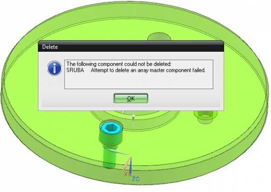 2) Spróbuj usunąć wszystkie części szyku ze złożenia. Podczas usuwania macierzystego pliku z którego powstał szyk pojawia się informacja że nie można usunąć części.