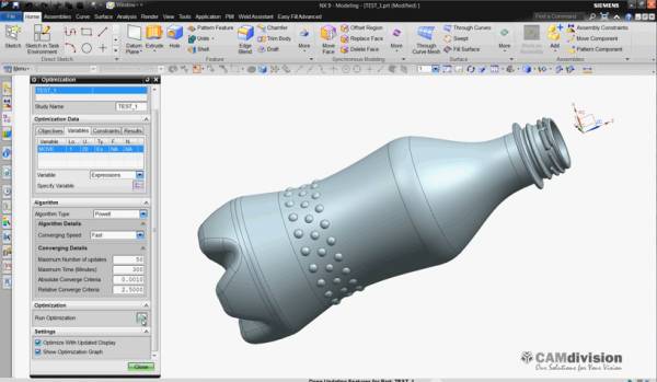 Poniżej zostały zaprezentowane filmy pokazujące sposób optymalizacji modelu w NX. Geometrią wykorzystaną do optymalizacji jest butelka. Jako wartość docelowa została wybrana objętość. Optymalizowane parametry to wysokość butelki (film nr 1) oraz rozmiar na wybranym przekroju (film nr 2).