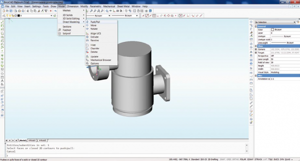 W rezultacie takich działań, otrzymaliśmy układ trzech rzutów – rzut z przodu, rzut z góry oraz widok izometryczny. Bardzo ważną kwestią, o której była już mowa wcześniej, jest automatyczna aktualizacja zmian geometrii odzwierciedlana na rzutach. Przyjmijmy, że wydłużeniu musi ulec jeden człon obiektu. W celu dostępu do modyfikacji bryły wystarczy przejść na pierwszą zakładkę (Model) i dokonać koniecznych zmian. Aby dokonać takiej zmiany, najprościej i najefektywniej będzie skorzystać z modelowania bezpośredniego. W tym celu wybieramy menu Model -> Direct Modeling -> Push/Pull (Rys. 7).