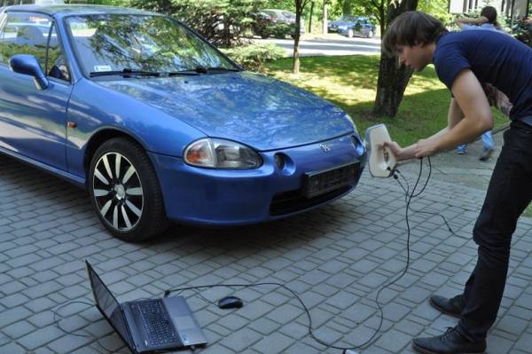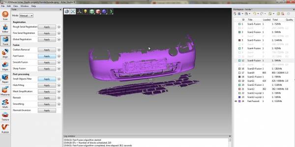 Pierwszy etap prac polegał na zdigitalizowaniu potrzebnej części samochodu, w naszym wypadku był to przedni zderzak. Proces ten został przeprowadzony przy pomocy skanera 3D Artec Eva. Skaner ten jest ręcznym skanerem 3D światła białego (występują również skanery stacjonarne), z możliwością zczytywania tekstury ze skanowanego obiektu. Oprócz zastosowań do wizualizacji, zapisana tekstura może być wykorzystana do łączenia skanów ze sobą (zapewnia to większą dokładność). W przeciwieństwie do skanerów stacjonarnych, do skanowania takich obiektów jak samochód, nie jest wymagany garaż z podłączeniem do sieci elektrycznej, cały proces został wykonany na parkingu. Do tego wystarczył zestaw: Notebook z naładowaną baterią, skaner Artec Eva oraz zewnętrzna bateria do skanera.