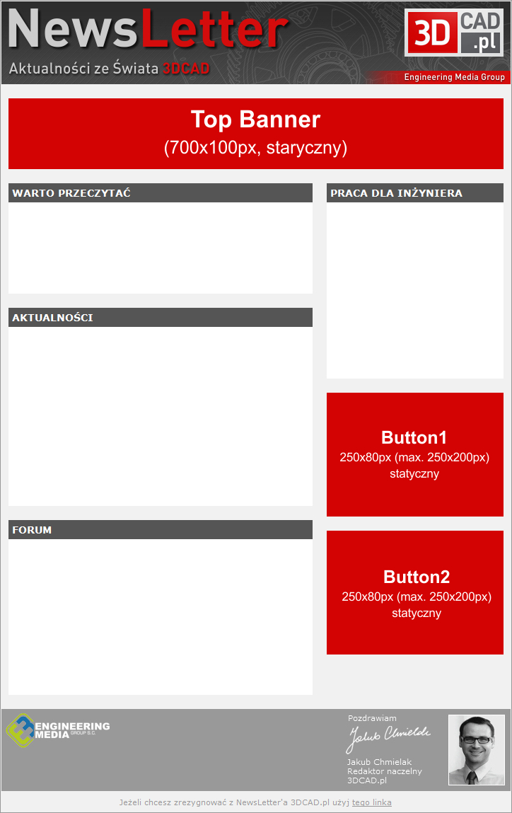 NewsLetter portalu 3DCAD.pl jest publikowany w każdy wtorek i czwartek. Do Państa dyspozycji oddajemy 3 powierzchnie reklamowe opisane poniżej.